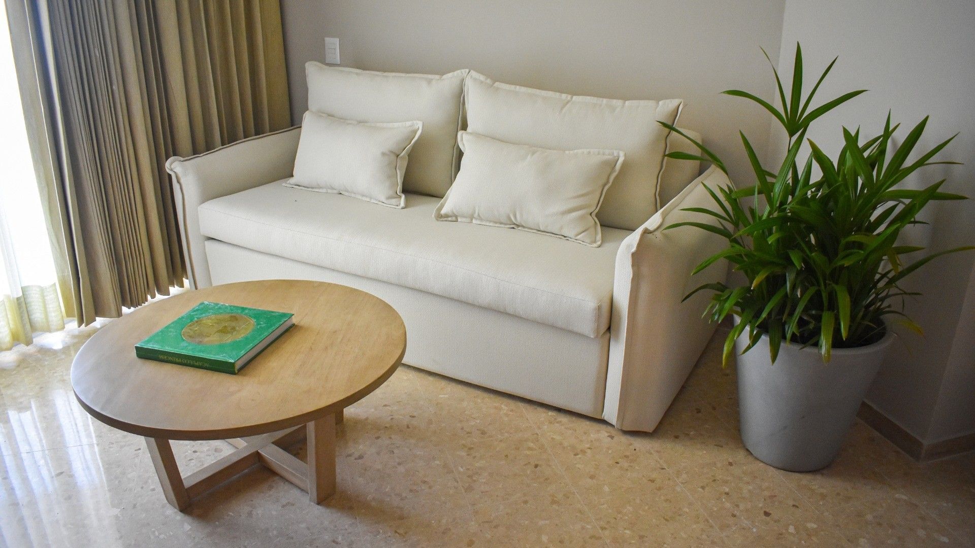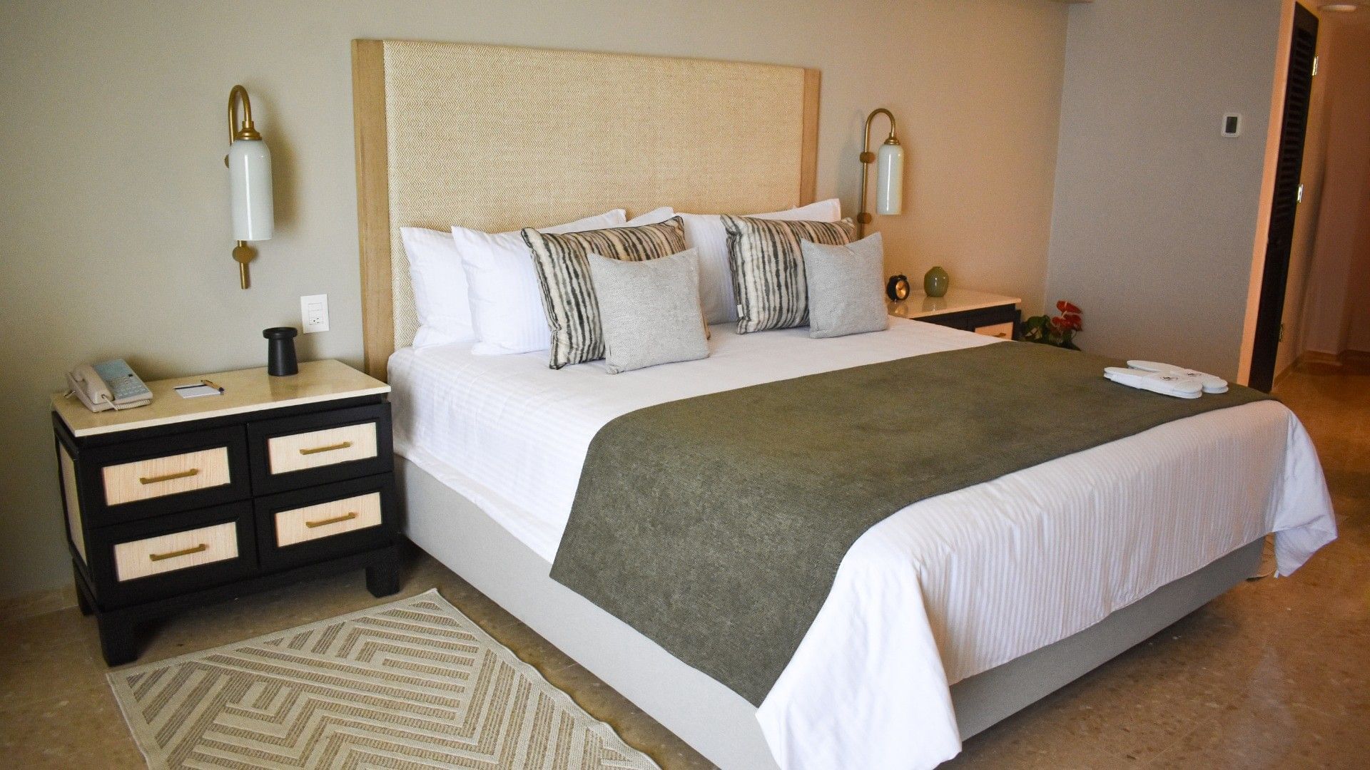 The Luxury Golf View Rooms seamlessly blend elegance and comfort within their 44 square meters. Featuring marble floors, glass doors with wooden shutters, and a casual tropical decor, these rooms offer a private balcony or terrace, perfect for intimate moments. Accommodating up to 4 guests, they are furnished with either a king-sized bed or two double beds, ample storage space, and the option for an extra bed or crib. Revel in the breathtaking views of the Princess Golf Course or the lush tropical gardens.