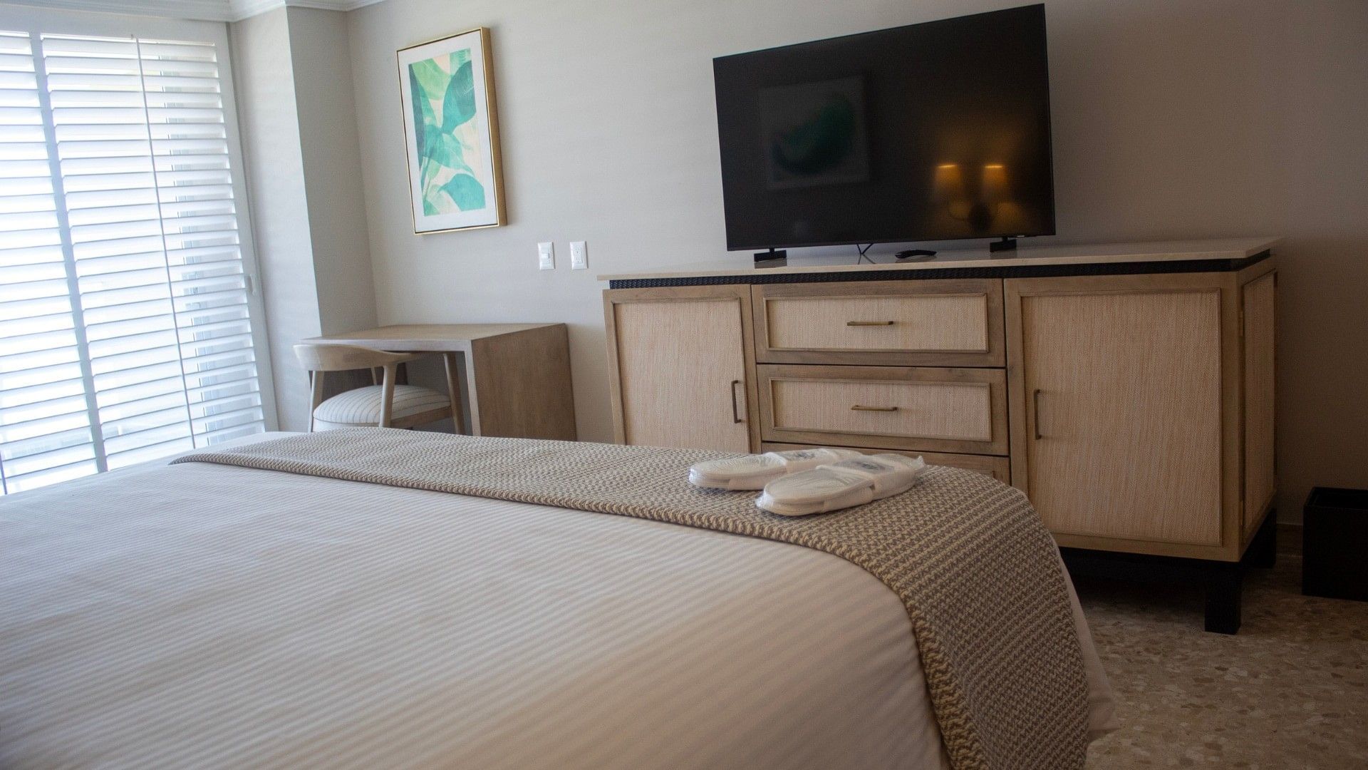Relájate en nuestras Habitaciones De Lujo Vista al Mar, con decoración tropical, balcón privado, pisos de mármol y vistas parciales al océano y albercas. Ideales para hasta 4 personas, con opción de cama extra o cuna.