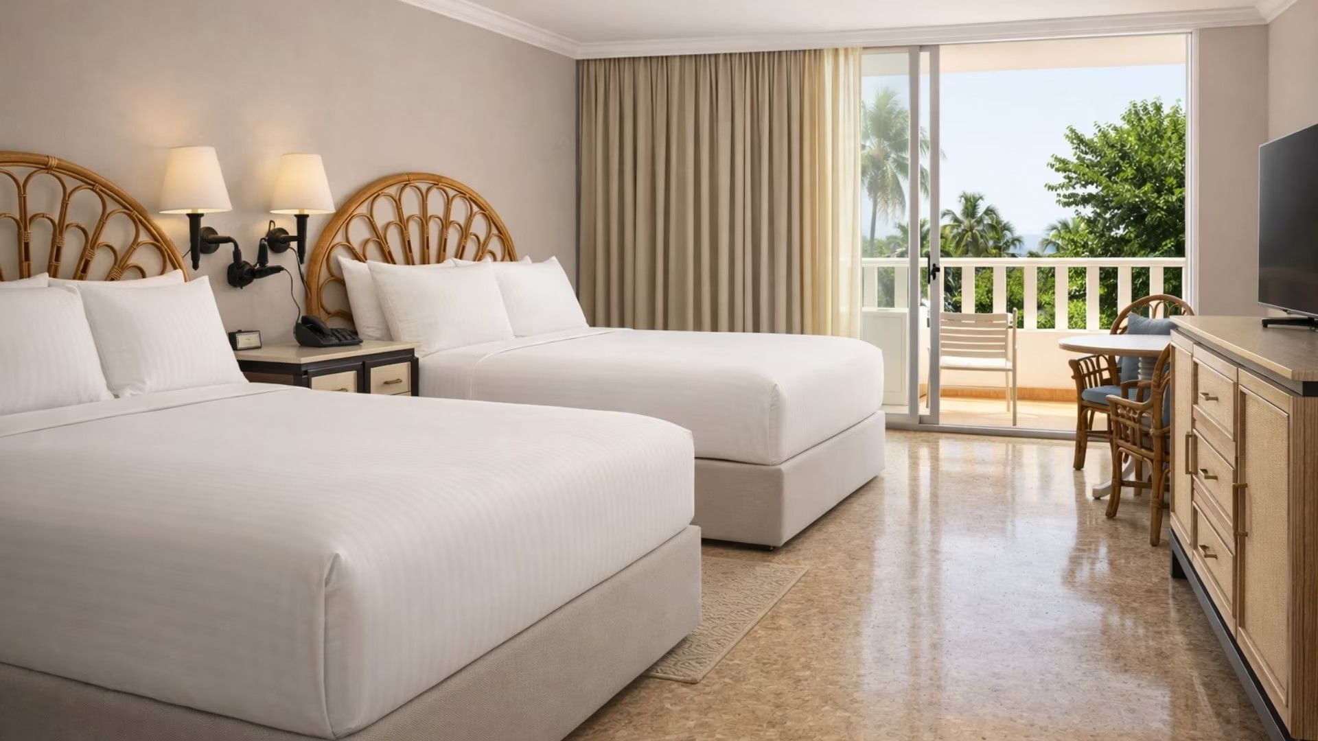 Disfruta de nuestras Habitaciones De Lujo Vista al Golf, con decoración tropical, terraza privada, pisos de mármol y vistas al Campo de Golf Princess o jardines tropicales. Perfectas para hasta 4 personas, con opción de cama extra o cuna.