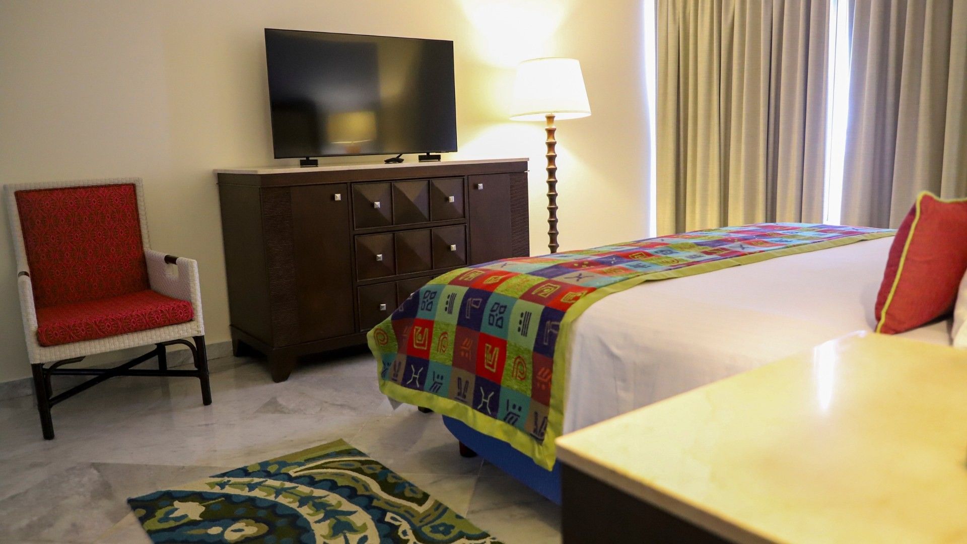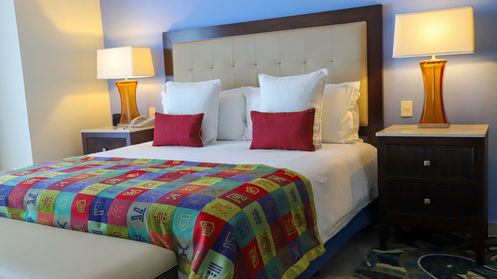 Relájate en nuestras Habitaciones De Lujo Vista al Mar, con decoración tropical, balcón privado, pisos de mármol y vistas parciales al océano y albercas. Ideales para hasta 4 personas, con opción de cama extra o cuna.