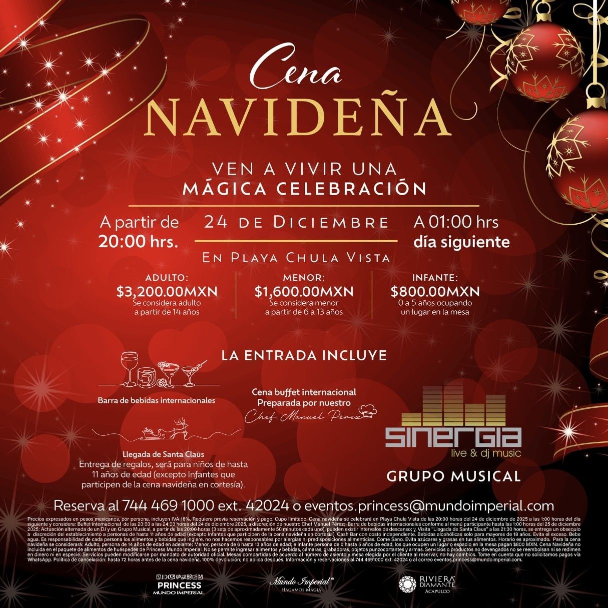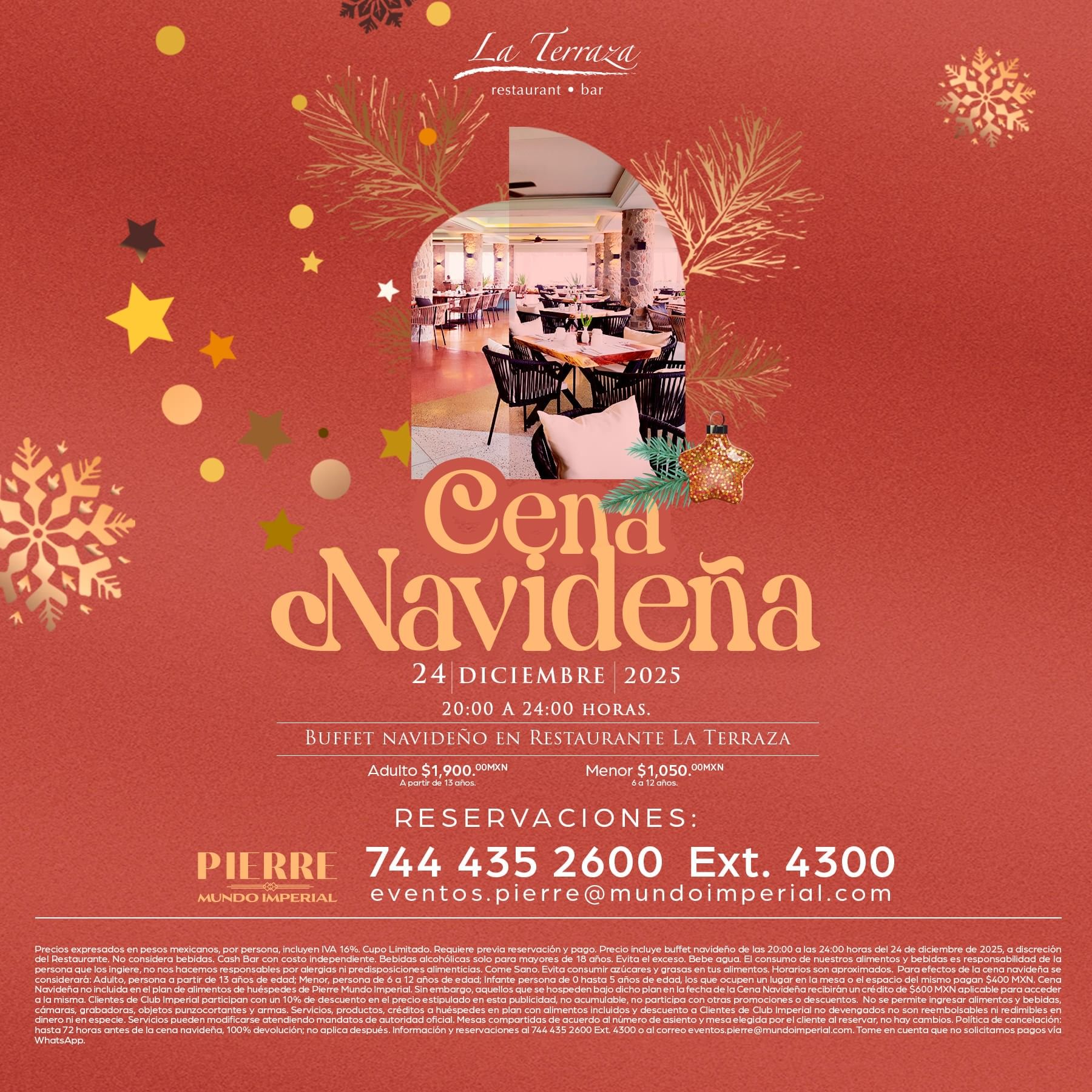 El 24 de diciembre se convierte en una noche verdaderamente mágica gracias a tres experiencias navideñas excepcionalmente especiales. En La Terraza de Pierre Mundo Imperial, la Cena Navideña deslumbra con una propuesta culinaria de alto nivel, servida en un ambiente íntimo lleno de elegancia natural, jardines tropicales y una brisa suave que envuelve cada momento con serenidad y encanto absoluto.