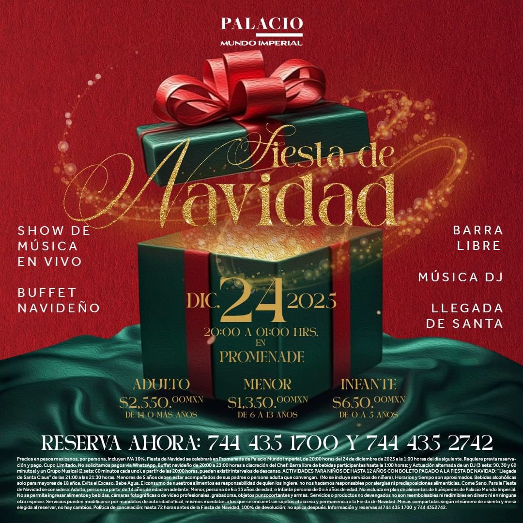 La noche continúa en el extraordinario Palacio Mundo Imperial, donde una renovada Cena de Nochebuena combina sabores tradicionales con un ambiente familiar, armonioso y lleno de luz, perfecto para quienes desean una velada memorable y cercana.